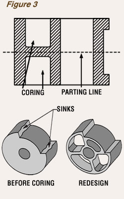 Cored holes can be used to reduce cross sections to within guideline limits, achieve uniform wall thickness, reduce material consumption, and reduce or eliminate machining operations. As shown in Figure 3, the preferred direction is parallel to the direction of the mold opening, in other words, perpendicular to the parting plane. Through holes are preferred to blind holes because the core pin is supported on both ends, whereas blind holes use a cantilevered pin.